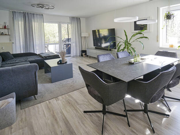 Objektbeschreibung Diese wunderschöne und hochwertig ausgestattete Wohnung überzeugt durch ihren modernen Grundriss sowie zahlreiche komfortable Ausstattungsmerkmale und bietet ein ideales Zuhause für anspruchsvolle Bewohner. Der großzügige, offen gestaltete Wohn- und Essbereich bildet das Herzstück der Wohnung und schafft durch seine lichtdurchflutete Atmosphäre ein angenehmes Wohngefühl. Von hier aus gelangen Sie direkt auf eine der beiden Terrassen, die zu entspannten Stunden im Freien einla...