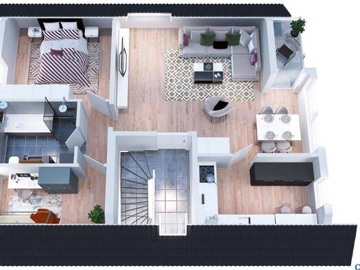 Wohnung mit nicht alltäglicher Aufteilung in einer ruhigen Sackgasse. Zugang über die große Sonnenterrasse auf der Garage. Im OG Küche mit Wohn-/Essbereich und großer Fensterfront. Der Zugang zum Dac...