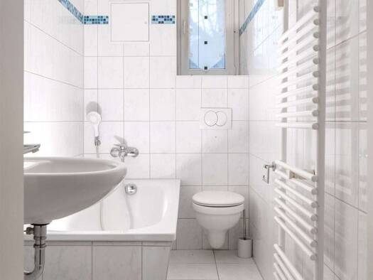 Schlafzimmer zur Hofseite mit Balkon Tageslichtbad mit bodengleicher Dusche modern gefliest Küche hinter dem Wohnzimmer Neue weiße Innentüren und Vinylbodenbelag Trockenboden, Kellerraum