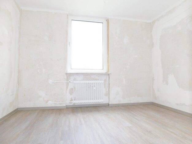 Über das Wohnzimmer gelangt man auf die sonnige Loggia. Neben einem Schlaf- und einem Kinderzimmer findet man zudem eine ausreichend große Küche mit angrenzendem Essbereich vor. Das weiß/anthrazit geflieste Tageslichtbad wurde mit einer Wanne und einem Waschmaschinenanschluss ausgestattet. Eine Gästetoilette ist ebenfalls vorhanden. Vor Einzug wird die komplette Elektrik erneuert. Die Decken werden mit Rauhfaser tapeziert und weiß gestrichen, die Wände werden tapezierfertig vorbereitet. Die Tür...