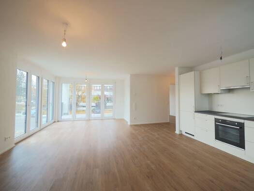 Wohnung: Schöne, helle, sehr gut geschnittene 3-Zimmer-Neubauwohnung, 81 qm, 1.OG, Massivbauweise, Effizienzhaus 55 Wohnzimmer mit großem Balkon mit Südausrichtung und Blick ins Grüne Neue, hochwertige Marken-Einbauküche mit Herd (Bosch), Spülmaschine (Bosch), Kühl-/Gefrierkombi (nofrost, Elektrolux) Tageslichtbad mit Wanne, ebenerdiger Dusche, WC Schlafzimmer, Kinder-/Arbeitszimmer, separates WC Kellerabteil, Gemeinschaftsraum, Fahrradraum, Wasch-/Trockenraum, Müllraum Barrierefrei (von Stadtb...