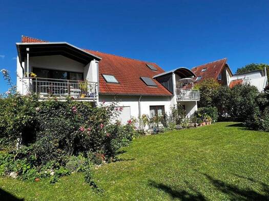 Die Haushälfte hat einen getrennten Eingang über Höhenweg 1. Sie wurde 1994 aus einem ehemaligen Scheunengebäude neu erbaut mit Ausnahme des Dachgeschosses, das mit Naturgebälk belassen wurde. Die Wohnung verfügt über eine Fußbodenheizung. Wenige Radiatoren. Schöne große Terrasse nach Süden ausgerichtet eingerahmt durch eine Buchenhecke.