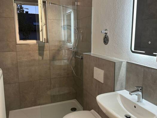Erdgeschosswohnung im Zweifamilienhaus mit zeitmäßiger und funktioneller Ausstattung Bad hellgrau gefliest mit Wandspiegelschrank Evtl als nötig erachtende Streicharbeiten von Wänden und Decken könne...