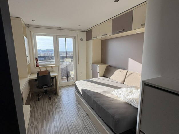 Zu vermieten ist ein praktisches Appartment ideal für Studierende in Garching. In sonniger Westlage genießen Sie bei unverbaubarem Ausblick herrliche Sonnenuntergänge. Die funktional eingerichtete Küche bietet alles, was man braucht und ist mit Herd, Kühlschrank, Dunstabzugsaube (neu 2026), Mikrowelle mit Grillfunktion (neu 2026) und Geschirrspülmaschine ausgestattet. Das funktional eingerichtete Zimmer lädt zum gemütlichen Verweilen und entspannten Lernen ein.