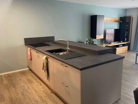 Barrierefreie Wohnung mit Einbauküche und Terrasse zu vermieten. Die Wohnung ist mit großen, grauen Fliesen und mit einer Fußbodenheizung ausgestattet. Das Bad mit Fenster ist modern in weiß und grau...