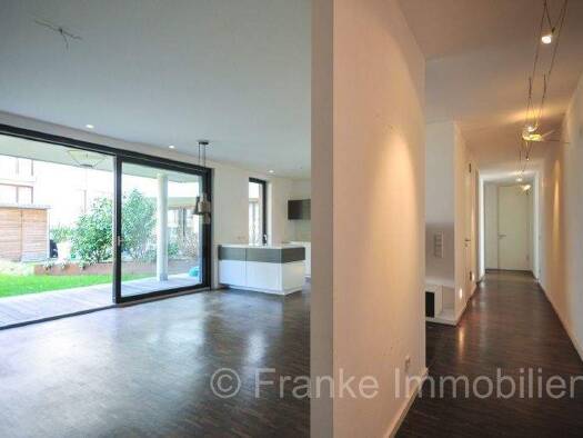 hochwertig ausgestatte 3-Zimmer-Wohnung mit Terrasse und Sondernutzungsrecht der dazugehörigen Grünfläche inkl. Gartenhäuschen und einer zweiten Terrasse samt Pergola - Wohnzimmer mit offener Küche u...