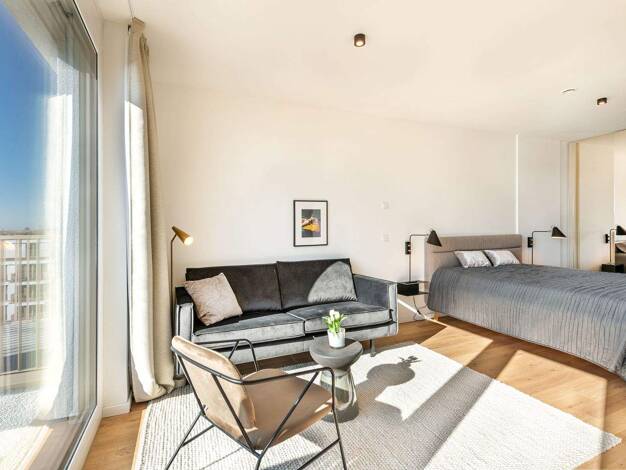 Diese lichtdurchflutete 1-Zimmer-Wohnung befindet sich im 6. Obergeschoss eines Neubaus, der Teil des neuen Premium-Quartiers "Kupa" ist. Den Bewohnern steht ein wegweisendes Sharing- und Service-Konzept zur Verfügung. Dieses umfasst ein Concierge-Angebot, einen E-Bike- bzw. Lastenrad-Mietservice, Carsharing, einen Co-Working-Space, eine individuell buchbare Küchen-Lounge, ein Paketbox-System und weitere Annehmlichkeiten. Ein Highlight ist die gemeinschaftlich genutzte Dachterrasse mit atembera...