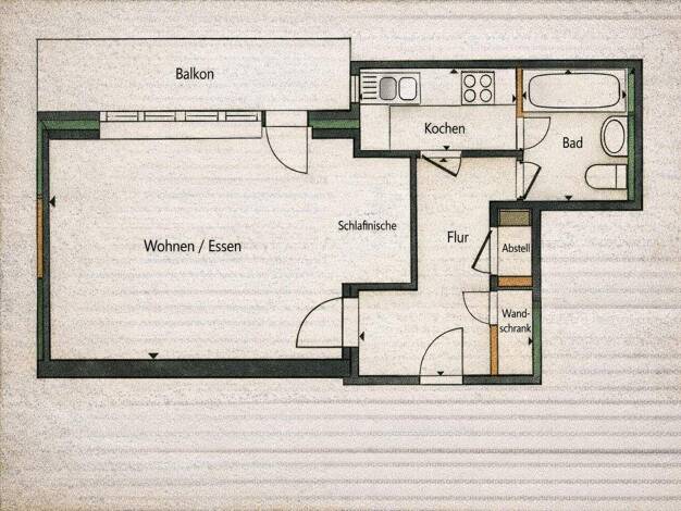 Diese kompakte, aber sehr gut geschnittene 2-Zimmer-Wohnung im 1. Obergeschoss eines gepflegten Mehrfamilienhauses bietet auf 42 m² alles für ein komfortables Wohnen. Die Wohnung verfügt jedoch über eine voll ausgestattete Einbauküche sowie ein modernes Badezimmer und einen Balkon. Das geräumige Wohn-/Schlafzimmer mit Südfenster sorgt für viel Licht und Ausblick. Es bietet Platz für Bett, Sitzecke und Stauraum sowie einen direkten Zugang zum Balkon - ideal zum Entspannen oder Frühstücken im Fre...