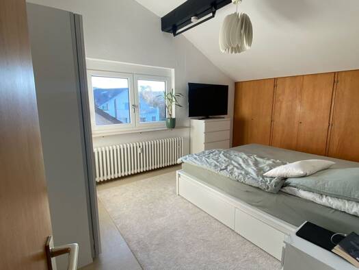Zur Vermietung steht eine helle und großzügige Dachgeschosswohnung mit einer Wohnfläche von ca. 90 m². Die Wohnung verfügt über einen separaten Eingang über eine Außentreppe und bietet dadurch ein hohes Maß an Privatsphäre. Die Wohnung wurde 2022 renoviert, zudem wurden die Fenster im Februar 2026 erneuert. Ausstattung der Wohnung: Wohnfläche: ca. 90 m² 2 Zimmer Separate Küche Badezimmer mit Badewanne und begehbarer Dusche Balkon Dachgeschosswohnung Separater Eingang über Außentreppe Neue Fenst...