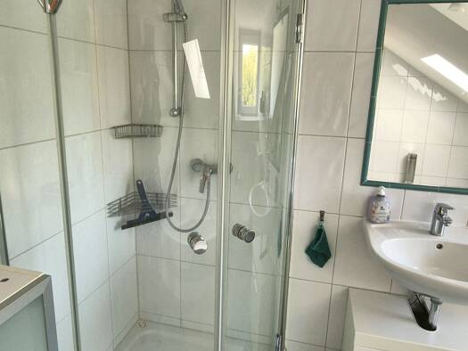 Die neu modernisierte 2,5 ZKDusche-Wohnung hat eine Wohnfläche von 52,24 m² und befindet sich im Dachgeschoss mit Schrägen. Die Einbauküche mit sämtlichen Einrichtungsgegenständen wurde zum Einzug neu eingebaut. Das Duschbad mit Echtglas-Duschabtrennung hat ein Fenster. Ein Gartenanteil zur eigenen Nutzung ist geduldet vorhanden (keine vertragliche Zusicherung). Kellerabteil ist vorhanden.