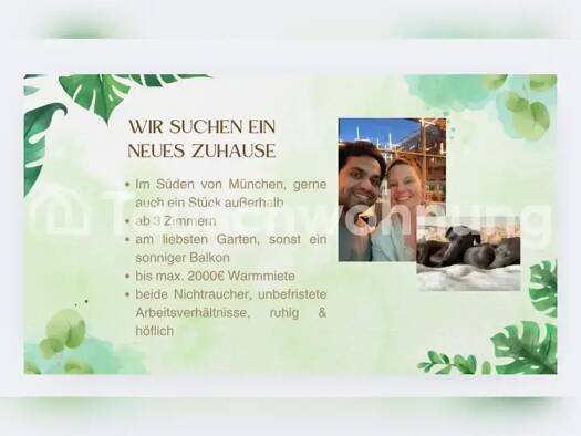 Wir suchen einen Nachmieter für unsere Maisonett Wohnung in Unterhaching, der unsere Wohnung als neuer Hauptmieter übernehmen kann. !!!! Nur für einzelpersonen oder Paare geignet. !!!!!! Es ist eine ...