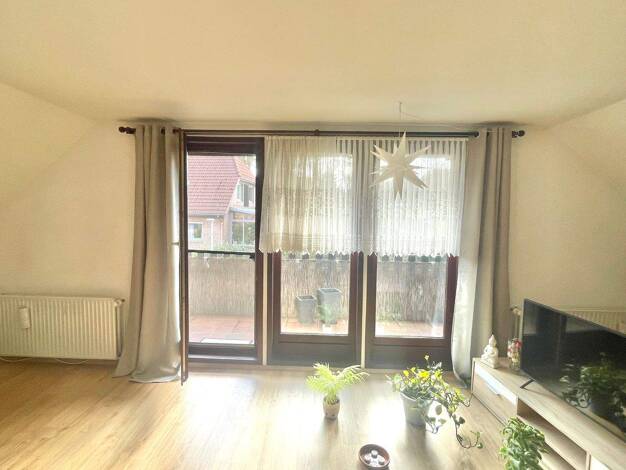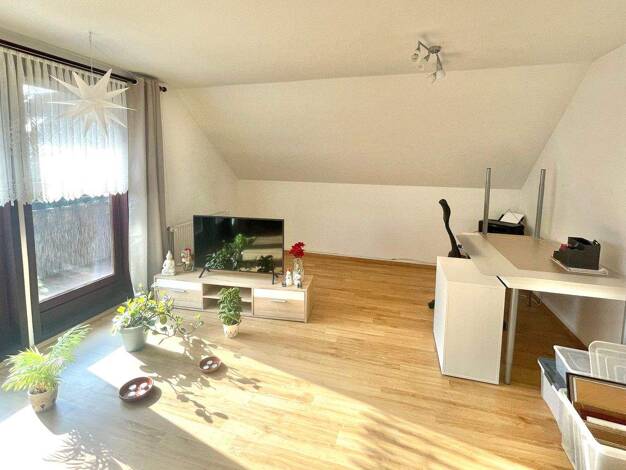 Diese charmante und besonders geschnittene 2,5-Zimmer-Dachgeschosswohnung bietet auf ca. 55 m² Wohnfläche genügend Raum für individuelle Entfaltung. Das großzügige Wohnzimmer befindet sich auf der Südwestseite des Hauses und bietet über eine große Terrassentür direkten Zugang zur vollständig überdachten Außenterrasse. Vom Wohnzimmer aus führt eine Treppe ins Dachgeschoss mit Zugang zu Küche, Bad und den weiteren Zimmern. Die Einbauküche bietet Platz für Kühlschrank, Backofen und Geschirrspüler....