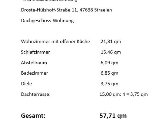 Das massive Wohnhaus wurde im Kalenderjahr 1991 im Stadtzentrum von Straelen errichtet. Insgesamt sind im Objekt 9 Wohneinheiten vorhanden. Die zu vermietende Wohnung befindet sich in einem Seitenteil des Objektes mit separatem Treppenhaus für insgesamt 3 Wohneinheiten. Die Wohnung liegt im Dachgeschoss. Im Objekt ist eine Gaszentralheizung vorhanden. Die Heizkosten werden mit Wärmezähler ermittelt und gem. Heizkostenverordnung abgerechnet. Zur Ermittlung der Frischwasser- und Schmutzkanalkoste...