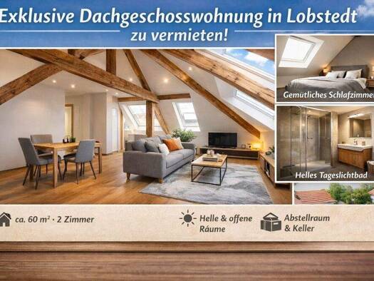 Diese schöne 2 Raum-Dachgeschosswohnung steht sofort zur Vermietung. Sie umfasst 61m² auf 2 Räume. Folgende Räume stehen zur Verfügung: Wohnzimmer mit offener Küche Schlafzimmer, Bad mit Dusche.