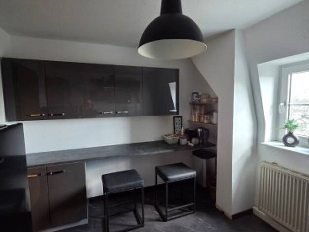 Objektbeschreibung Sie betreten Ihre neue Wohnung im 1.Dachgeschoss und erreichen über die in der Wohnung liegende Treppe die zweite DG-Ebene zum Wohnen * ein zentraler Raum bietet unter Dachschrägen und Sichtbalken ausreichend Platz zum Wohnen, Schlafen und Arbeiten * viel Licht spenden die bodentiefen Fenster und die verglasten Gauben im offen angrenzenden Küchenbereich (schöne Einbauküche vorhanden) und dem separaten Tageslichtbad mit Dusche und Platz für Ihre Waschmaschine * Highlight ist d...