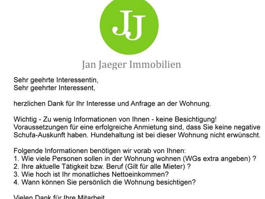 Bitte beachten Sie, dass es sich um eine Service- bzw. Seniorenwohnanlage handelt und sich das Angebot gemäß den Förderbedingungen ausschließlich an unsere älteren Mitbürger bzw. Mitbürger mit körperlichen Einschränkungen richtet. Weiterhin benötigen Sie einen Wohnberechtigungsschein, um die Wohnung beziehen zu können. Die Wohnung befindet sich in einer gepflegten Wohnanlage die durch den Malteser Hilfsdienst betreut wird. Für die die Inanspruchnahme der Betreuungsleistungen fallen separate Kos...