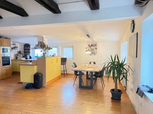 Diese großzügige 3-Zimmer-Dachgeschosswohnung in einem gepflegten Zweifamilienhaus bietet auf ca. 90 m² ein behagliches Zuhause mit viel Charme. Die charakteristischen Dachschrägen verleihen den Räumen eine besondere Wohnatmosphäre, während die durchdachte Raumaufteilung ein angenehmes und offenes Wohngefühl schafft. Das helle Wohn- und Esszimmer mit Laminatboden bietet viel Platz für individuelle Gestaltungsideen. Die angrenzende Küche in ansprechender Buchenoptik kann bei Bedarf vom Vormieter...