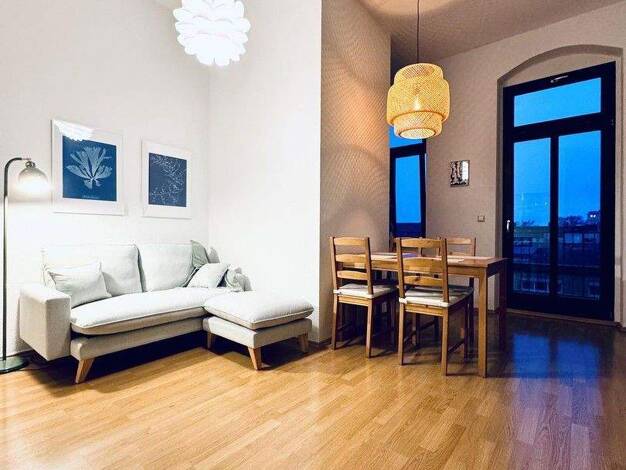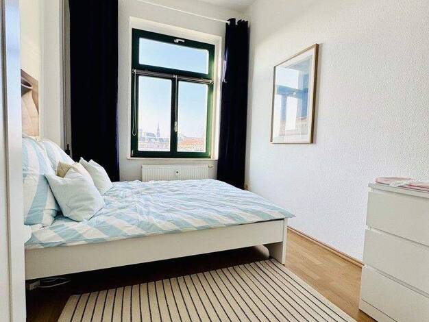English follows: Absolut spektakuläre komplett möblierte 2-Zimmer-Wohnung im sanierten Gründerzeitbau in Dresden Neustadt. Vom ca. 12 qm großen Balkon hat man einen fantastischen Weitblick über die D...