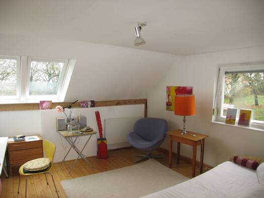 Helle, freundliche Wohnung über zwei Etagen in einem 4-Fam.-Haus mit einer herrlichen Dachterrasse. Die Hauptwohnung ist im Dachgeschoss. Einteilung: Koch-/Ess-/Wohnbereich, Schafzimmer, Bad und ein Studiozimmer (Büro/Gästezimmer) - bitte beachten Sie, dass das Studiozimmer nicht als Kinderzimmer geeignet ist, da offen gehalten und nur über eine steile Treppe erreichbar.