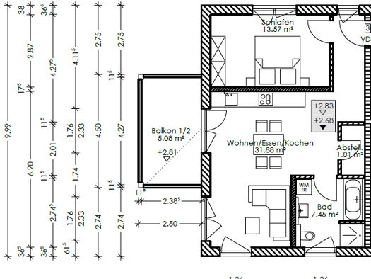 3 Zimmer, Küche, Bad, Abstellraum 93qm Wohnfläche + 8qm Nutzfläche überdachter Balkon in Süd-Ausrichtung