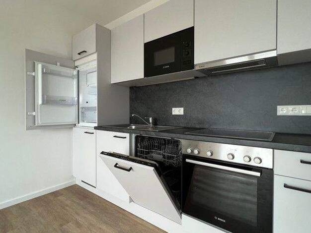 Objektbeschreibung Die 2018 erbaute Stadtvilla verfügt über lediglich 3 Mieteinheiten. Im Erdgeschoss befindet sich eine Büroeinheit, im Obergeschoss befinden sich die zwei 1-Raum Wohnungen. Jede Wohnung erhält kostenfrei einen Stellplatz neben dem Haus. Raumaufteilung Die Wohnung verfügt über eine geräumigen Koch- & Essbereich mit vollausgestatteter Einbauküche inkl. Geschirrspüler und Kaffeemaschine. Von hier aus geht es auf den großzügigen Balkon mit Blick ins Grüne. Das Badezimmer mit F...