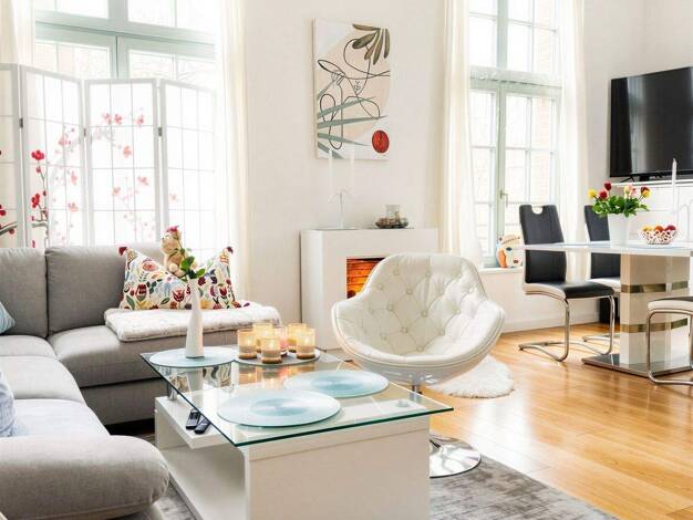 Wohnen auf Zeit in Spandau (Berlin): Tolle grosse Wohnung mit gut 72 qm möbliertes Zuhause auf Zeit. Wohnung im Dachgeschoss mit Attika und im Loft style. Die Wohnung ist komplett eingerichtet, Boxspringbett, schickes Wohnzimmer, Ankleidesystem, komplette Einbauküche, Bad mit Dusche, Waschmaschine mit integriertem Trockner vorhanden (keine Gebühren), Lese- oder Ruhebereich im Turm mit schöner Aussicht in Südlage. Balkon / Loggia in sonniger Südlage. Gastgeber sprechen auch Englisch. Concierge-S...
