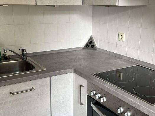 Das innenliegende Bad ist neutral weiß gefliest, mit Wanne + Dusche ausgestattet und weiterhin mit Waschmaschinenanschluss ( Platz für 45cm!) versehen. Die geräumige Küche bietet Platz für einen klei...