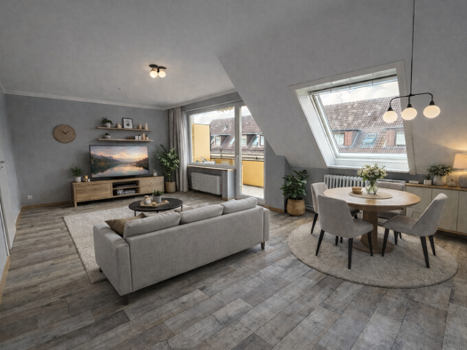 Diese attraktive 2-Zimmer-Wohnung im Dachgeschoss überzeugt durch eine durchdachte Raumaufteilung und viel Tageslicht. Das großzügige, helle Wohnzimmer bildet den Mittelpunkt der Wohnung und bietet ausreichend Platz für einen gemütlichen Wohn- und Essbereich. Ein besonderes Highlight ist der schöne Balkon mit Süd-West-Ausrichtung, der viele Sonnenstunden bietet und zum Entspannen am Nachmittag und Abend einlädt. Trotz der Lage im Dachgeschoss verfügt die Wohnung über nur wenige Dachschrägen, wo...