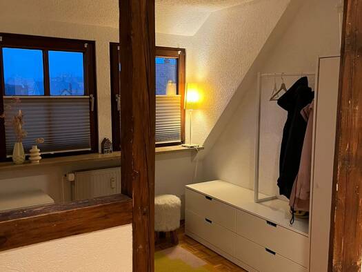 Die vollmöblierte Dachgeschoßwohnung befindet sich im 3.OG eines schön renovierten Fachwerkhauses. Das Haus steht unter Denkmalschutz. Ein Schreibwarenladen und eine Zahnarztpraxis sowie ein Friseurs...
