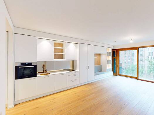 Diese 2-Zimmer-Wohnung überzeugt durch modernes Design, hohen Wohnkomfort und eine durchdachte Raumaufteilung. Der großzügige Wohn- und Essbereich mit offener Küche besticht durch bodentiefe Fenster, die viel Tageslicht hereinlassen. Das separate Schlafzimmer bietet einen ruhigen Ort zum Entspannen und ausreichend Platz für persönliche Gestaltungsideen. Hochwertiges Parkett und ausgesuchte Materialien verleihen den Räumen eine warme und stilvolle Atmosphäre. Die moderne Einbauküche mit hochwert...