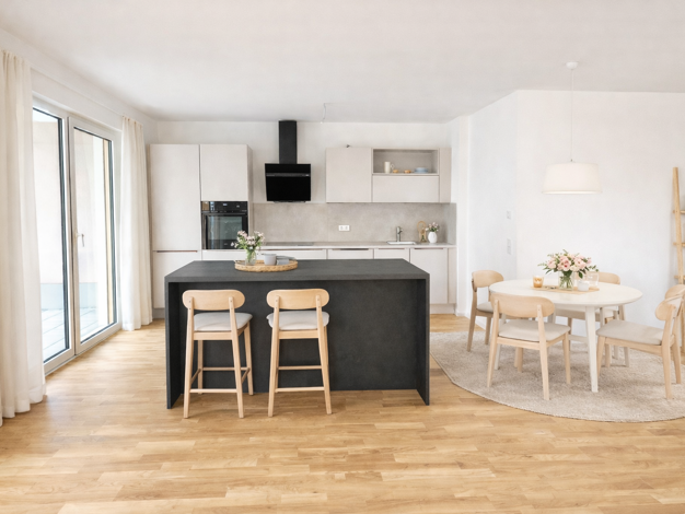 Die Wohnung besteht aus vier Zimmern, einer voll ausgestatteten Küche, einem modernen Badezimmer, einer kleinen Waschküche und einer Abstellkammer sowie Fußbodenheizung. Heizung und Warmwasser werden über Wärmepumpen versorgt. Sie liegt im ersten Stock eines schönen neugebauten Mehrfamilienhauses. Die Wohnfläche beträgt 103 Quadratmeter und ist sehr hell und schön gestaltet. - geräumiges Wohnzimmer mit zwei Balkonen und großzügigen Fenstern/Türen, Klimaanlage und voll ausgestatteter offener Küc...
