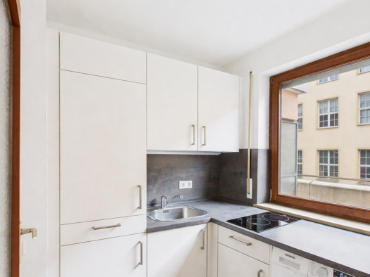Zur Miete wird eine modernisierte 1 Zimmer Wohnung mit Balkon. Eine Einbauküche ist in der Miete mit einkalkuliert.