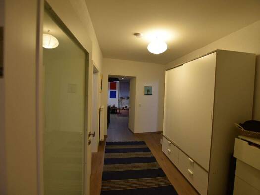 Die angebotene 4-Zimmer-Wohnung befindet sich im 1. Untergeschoss eines gepflegten Wohn- und Geschäftshauses in der Hauptstraße 343. Der Zugang zur Wohnung erfolgt über das gemeinschaftliche Treppenhaus. Beim Betreten der Wohnung gelangt man in den zentralen Flur, von dem aus alle Räume erreichbar sind. Vom Flur aus geht das Badezimmer ab, ausgestattet mit Dusche, Badewanne und Pissoir. Das Bad verfügt allerdings über kein Fenster. Ebenfalls vom Flur erreichbar ist das großzügige Wohn- und Essz...