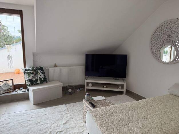 Wohnung mit 3Balkone und Terrasse, Bad mit Dusche WC und Urinal, 2 Schlafzimmer und Dachstudio, großes Wohnzimmer, Küche mit angrenzendem Arbeitszimmer. Heizung: Scheitholz und Öl sowie Solar
