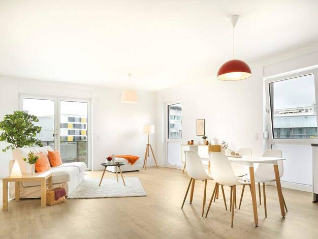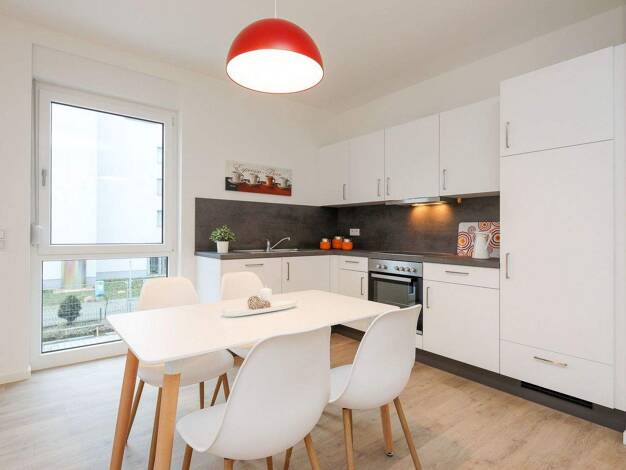 Wohnkomfort auf höchstem Niveau . Lichtdurchflutete Räume durch große Fensterfronten . Offener Wohn- und Essbereich für geselliges Beisammensein . Moderne Einbauküche mit funktionaler Ausstattung . Gemütliches Schlafzimmer für erholsame Nächte . Zeitgemäß ausgestattetes Badezimmer Ihr privater Rückzugsort . Sonniger Balkon mit Blick ins Grüne . Perfekt für entspannte Stunden im Freien . Idealer Platz für Frühstück oder Feierabend-Drink