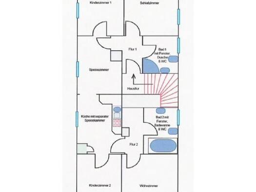 Die Wohnung befindet sich im Obergeschoß (1. Etage) des aufwändig sanierten Altbaus. Außer einer geräumigen Einbauküche (mit Speisekammer), die mit sämtlichen Elektrogeräten ausgestattet ist (vollintegrierter Geschirrspüler, Elektroherd, Ceranfeld, Dunstabzugshaube, Kühl-/ Gefrierkombination...) verfügt sie über ein separates Speisezimmer, 2 Kinderzimmer, ein großes Schlafzimmer sowie ein Wohnzimmer mit zwei Fenstern. Des Weiteren sind zwei Bäder (jeweils mit Fenster) vorhanden, wobei eines mit...