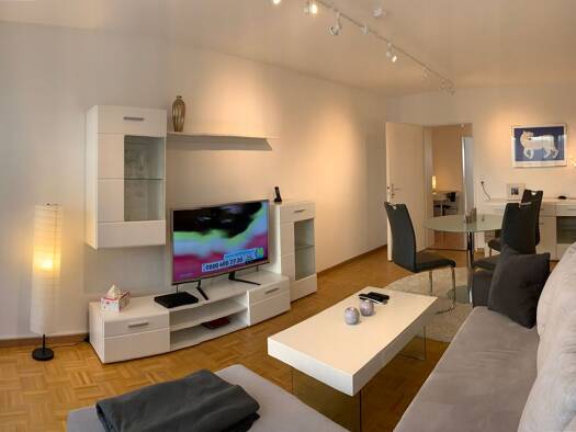Sonnige 3,5-Zimmer-Wohnung mit 2 Balkonen, Garagenstellplatz und Keller. Die Wohnung liegt im 2. OG eines sehr gepflegten Mehrfamilienhauses. Im Wohn- und Esszimmer befinden sich eine Sitzecke, ein Tisch für 4 Personen und ein Smart-TV mit Streamingfunktion. Internetverbindung ist vorhanden unk inklusive in Gesamtmiete. Die Einbauküche ist voll ausgestattet mit einem Kühlschrank mit Gefrierfach, Spülmaschine, einem 4-Platten-Induktionsherd, einem Multifunktionsbackofen und sämtlichem Kücheninve...