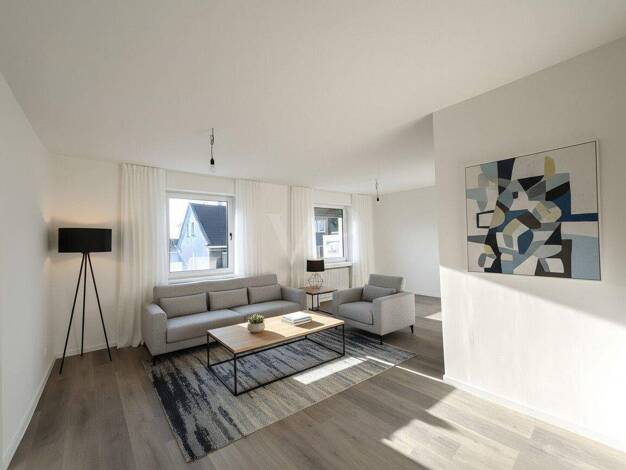 Die schöne 93 m² große Wohnung im ersten Stock eines ruhigen Zweifamilienhauses besticht durch eine perfekte Kombination aus modernem Design und effizienter Gestaltung. Komplett renoviert, präsentiert sich diese Wohnung mit einem modernen Grundriss, der Stil und Funktionalität mühelos vereint. Der großzügige Wohnbereich fließt nahtlos in eine gut ausgestattete Küche über, die über alle notwendigen Geräte verfügt und somit ein idealer Raum für kulinarische Abenteuer und lebhafte Zusammenkünfte m...