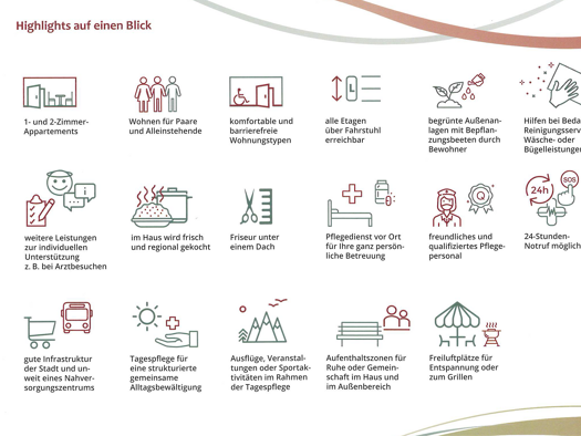 -Wohnpark mit 7000 qm großem Areal -Insgesamt 35 Wohneinheiten -30 x 1-Zimmer Appartments -Friseur unter einem Dach -2 Aufzüge, 3 Treppenaufgänge -auf die Bewohner zugeschnittener Pflegedienst -individuelle Tagespflege -hauseigene Küche -Gemeinschaftsraum -24h Betreuung
