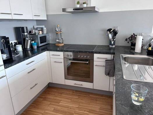 Die möblierte 3,5 Zimmer-Wohnung befindet sich im Erdgeschoss eines 6-Familienhauses mit großem Garten, wodurch man aus jedem Zimmer heraus ins Grüne schaut. Die Wohnung selbst wurde 2019 komplett renoviert, 2024 folgten das Bad und das Gäste-WC. Im hellen und großen Wohn- / Essbereich ist eine hochwertige Küche mit Steinplatte, ein Sideboard und ein Geschirrschrank beide aus Massivholz, ein ausziehbares Schlafsofa, sowie eine Sitzgarnitur der Marke Voglauer integriert. Im Flur ist ein maßangef...