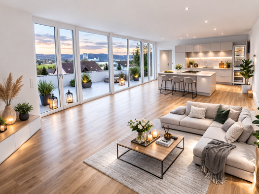 Wohnung Nr. 5 (EG) Diele: 9,91 m² Abstellraum: 2,73 m² Flur: 11,62 m² Wohnen/Essen/Küche: 43,77 m² Gäste-Bad: 5,52 m² Zimmer 1: 13,84 m² Schlafen: 14,33, m² Ankleidebereich: 8,29 m² Badezimmer: 12,06 m² Terrasse (Süd): 11,74 m² (Realfläche) Terrasse (West): 6,38 m² (Realfläche) Gesamt: 131,12 m²