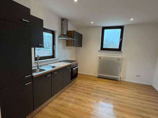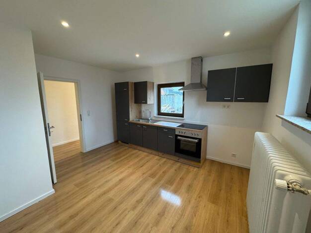 Vermietet wird hier ab sofort eine neu sanierte 2-Zimmer-Wohnung im EG eines Mehrfamilienhauses (insgesamt 9 Parteien) auf zwei Ebenen. Dies ist die erste fertig gestellte Wohnung nach Komplettsanierung von insgesamt 7 Wohnungen. Über 1 Treppenstufe gelangen Sie im EG zu der hellen und gemütlichen Wohnung, ausgestattet mit Laminatboden. Im EG befindet sich die helle Küche (13,16 m²) mit integrierter neuer Einbauküche (incl. Kühlschrank, Cerankochfeld + Backofen, Abzugshaube). Hier findet sich u...