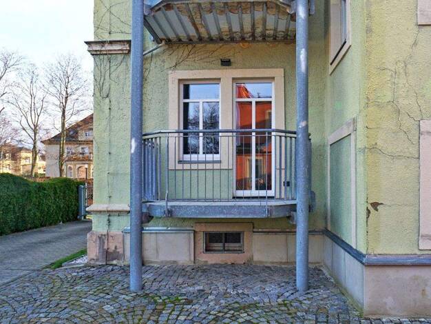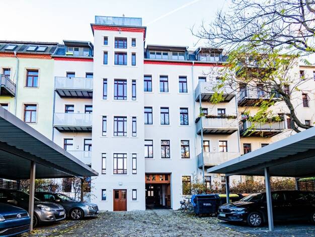 Die Wohnung liegt in einem Mehrfamilienhaus in Dresden- Striesen. Zum Grundstück gehört ein Innenhof.