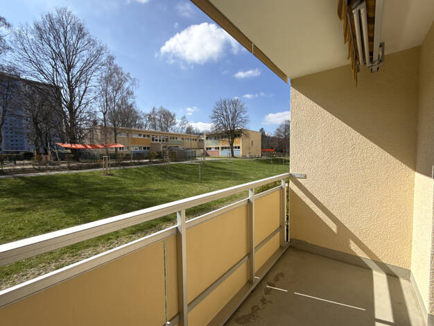 Herzstück dieser bezaubernden Wohnung ist das Wohnzimmer. Die breite, bodentiefe Panoramafensterverglasung sorgt für strahlende Lichteinflüsse und eine optische Raumerweiterung nach draußen auf den schon fast terrassenähnlichen Balkon. So haben Sie nicht nur im Wohnbereich viele Gestaltungsmöglichkeiten, auch im Außenbereich können Sie es sich wie es sich für ein Freiluftwohnzimmer gehört, gemütlich machen. Wie wäre es mit einer Loungeecke für einen entspannten Tagesausklang in der Abendsonne? ...