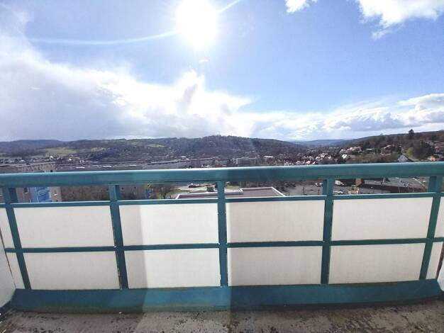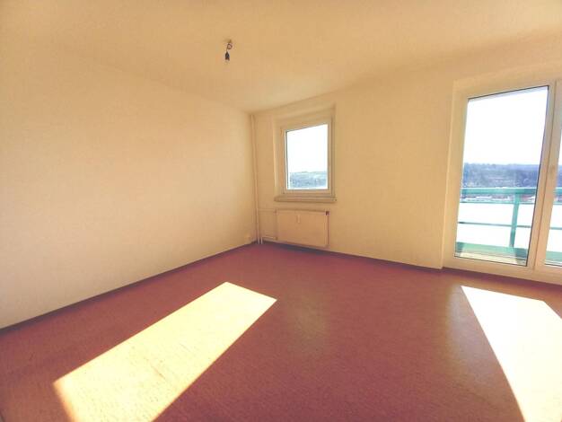 Diese 3-Zimmer-Wohnung in der Allendestraße 98574 Schmalkalden bietet eine Wohnfläche von 57 m². Die Wohnung befindet sich im 5. Obergeschoss eines gepflegten Gebäudes. Sie verfügt über zwei Schlafzimmer, ein Badezimmer sowie einen hellen Wohnraum mit Zugang zum Balkon. Der Balkon mit blau-weißer Brüstung gewährt einen schönen Ausblick auf die hügelige Landschaft und die umliegende Stadt.