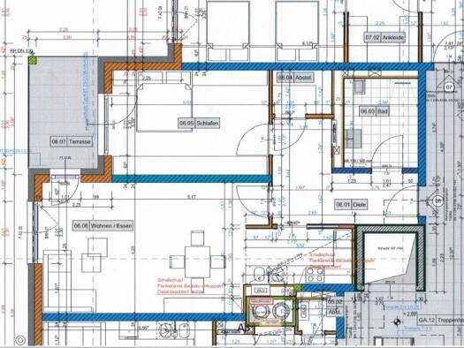 Insgesamt hat die Wohnung 3 Zimmer, Küche, Bad und Terrasse mit einer Wohnfläche von 96 qm^2. Das Badezimmer verfügt über eine große begehbare Dusche. Vom Ess-Wohnzimmer gelangt man direkt auf die gr...