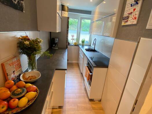 Diese Wohnung befindet sich in einem gepflegten Mehrfamilienhaus im EG und die Kaltmiete beträgt 1.210,00 (incl. EBK,Garten und TG-Stellplatz). Sie hat ein helles Wohnzimmer mit offener Küche, ein Schlaf- und ein Kinderzimmer, ein Tageslichtbad mit Wanne und Dusche, ein Gäste-WC, eine Diele, einen Mehrzweckraum für WM und Kühlschränke, angrenzend an die Küche, sowie einen Abstellraum auf der Etage. Der grosse Eckbalkon ist vom Wohnzimmer und der Küche aus zu begehen. Zur Wohnung gehören ein Gar...