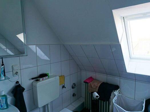 Die 2-Zimmer-Dachgeschosswohnung mit ca. 43 m² Wohnfläche erstreckt sich über zwei Ebenen. Eine Einbauküche, die dem Mieter zur Nutzung überlassen wird, ein helles Badezimmer mit Waschtisch und Spiegelschrank sowie ein eigener Kellerraum runden das Angebot ab. Der vorhandene Garten steht den Mietern zur gemeinschaftlichen Nutzung zur Verfügung.