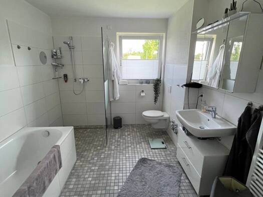 Die Wohnungen sind mit modernen und zeitlos schönen Bädern ausgestattet. Auf dem Boden haben wir einen schicken Design-Vinyl-Boden verlegt. Ein angenehmes Raumklima wird im Winter durch eine moderne Fußbodenheizung erzeugt. Für mehr Bequemlichkeit sorgen elektrische Rollläden und ein Kabel-TV Anschluss auch im Schlafzimmer. Sie kommen - dank des Aufzugs - barrierefrei in die 2. Etage Ausstattung: - Fußbodenheizung - elektrische Rollläden - Kabelanschluss in allen Wohnräumen - Bad mit bodenglei...