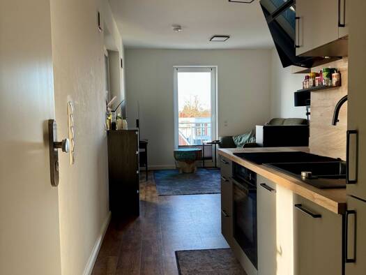 Die Wohnung verfügt über einen großzügigen Wohnbereich mit offener Küche, die durch elegante Glas-Schiebetüren optisch voneinander getrennt sind. Das Schlafzimmer ist offen mit einer begehbaren Ankle...